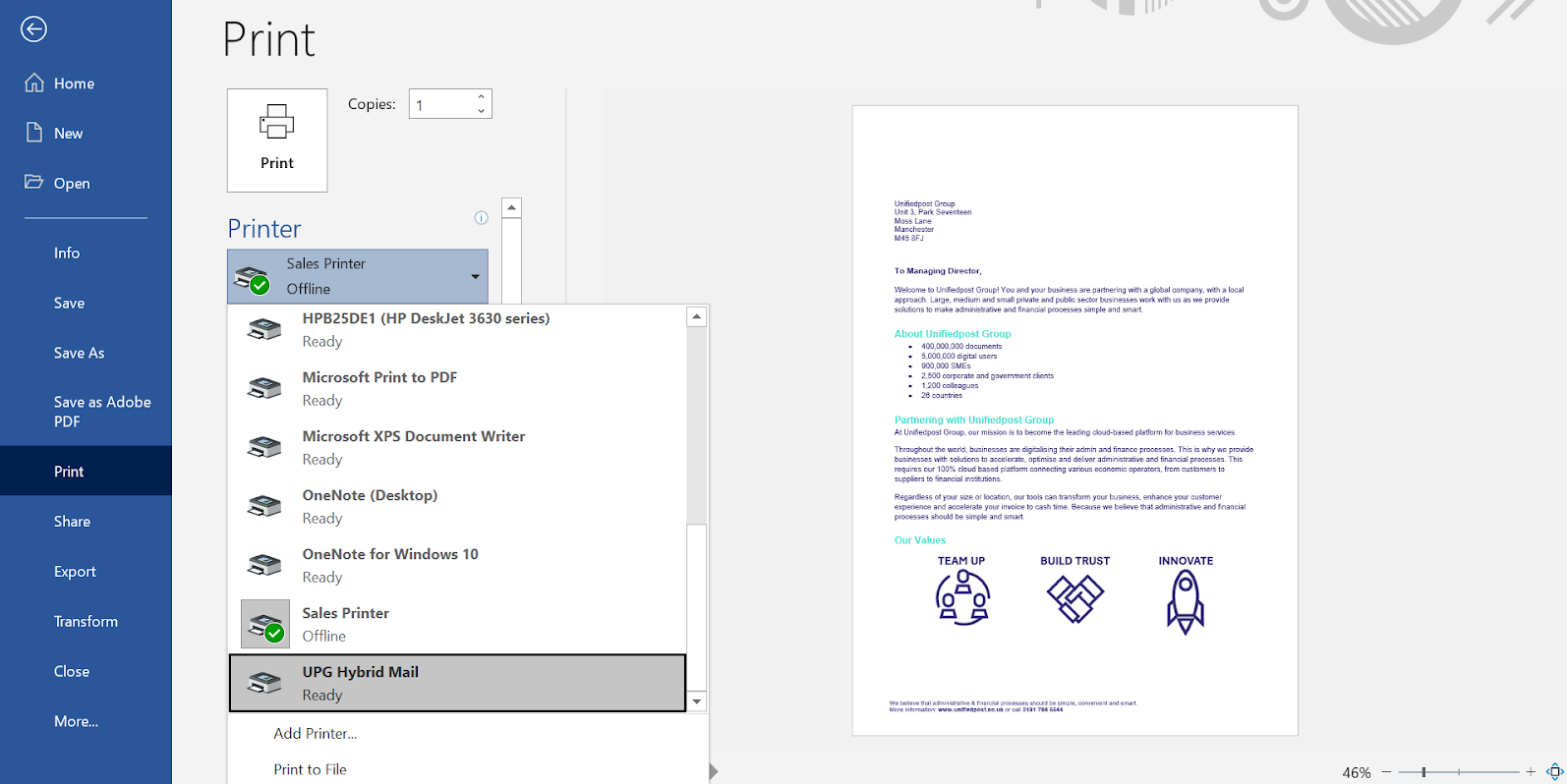 - Click to print, as you would do if you were printing your document via your usual printer. Then select your provider’s printer option.